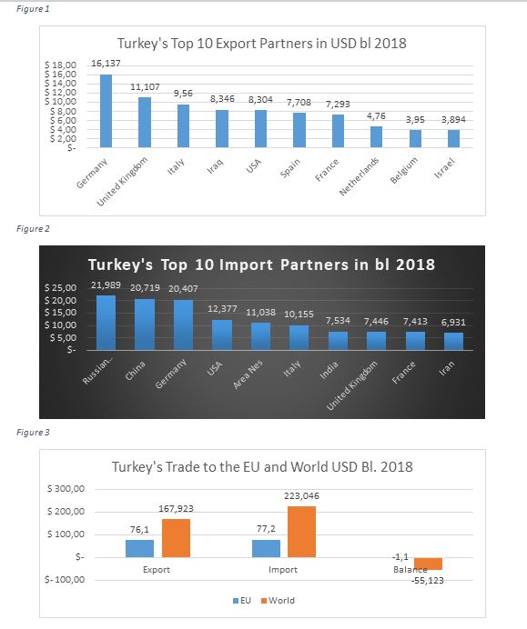 قسمی که یاد آوری گردید، روابط اقتصادی و تجاری ترکیه در وابستگی با غرب مخصوصاً اتحادیه اروپا قرار دارد. اگر به ارقام تجاری ترکیه از دید مازاد و کسر تجارت خارجی نظر اندازی نماییم، پس در می یابیم که روابط تجاری ترکیه با اتحادیه اروپا از یکسو بزرگ و مهم و از سوی دیگر متوازن می باشد. اما اگر روابط اقتصادی و تجاری کشور را در عین معادله مقایسوی با روسیه، چین، ایران و هند ببینیم، پس متوجه می شویم که ترکیه از دید تجارت خارجی در برابر پارتنرهای اورآسیایی با کسر تجاری قابل ملاحظهٔ روبروست. بر اساس آمار های تجاری صادراتی بین المللی، فدراتیف روسیه پارتنر شماره 12، چین پارتنر شماره 16، ایران پارتنر شماره 19 و هند پارتنر شماره 37 ترکیه است. اما در عین زمان همین کشور ها از جمله ده بهترین پارتنر های وارداتی ترکیه می باشند که ذبلاً در دیاگرام های زیرین درج گردیده اند: