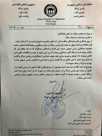 تذکرلازمی :عکس و سند نامه پارلمان عنوانی وزارت محترم دولت در امور پارلمانی فوق را افغان پیپر (شبکه ی اطلاع رسانی افغانستان) به دست نشر سپرده بود که اکنون به نظر میرسد ازسایت و حتااز انترنت بیرون شده است. من برای وضوح بیشتر عین متن را از روی ویدیوی طلوع نیوز عکسبرداری کرده ذیلن خدمت کاربران عزیز در پای همان سند جابجا می نمایم .( 4)